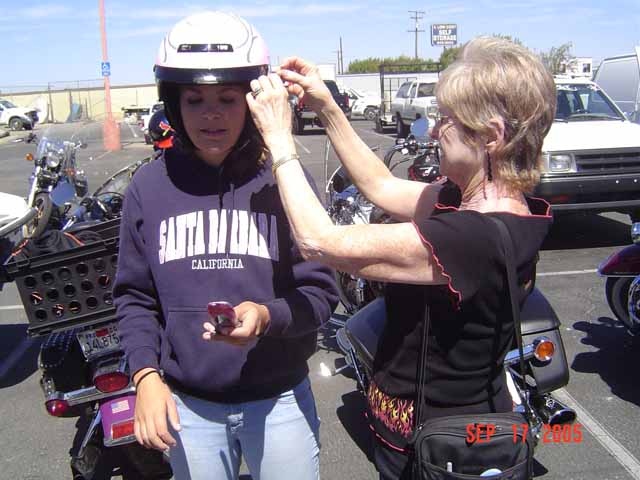 this for a couple of generation gaps? Judy's being Ms. Grandma -- taking the tag off Dani's brand new helmet... while Dani is checking her cell phone for messages!!!!! Pretty much says it all...doesn't it? ;) |